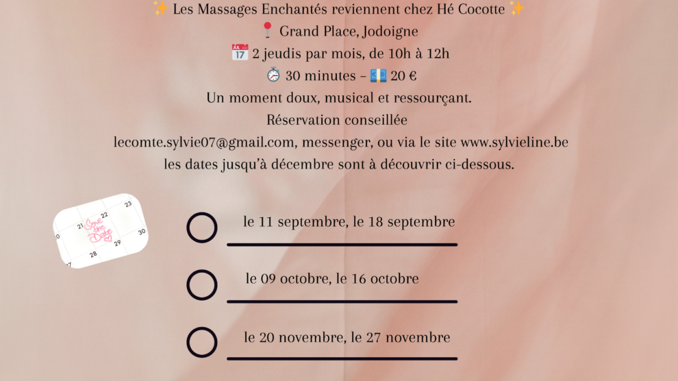 🌸 Les Massages Enchantés reviennent chez Hé Cocotte 🌸 📍 Grand Place, Jodoigne 📅 2 jeudis par mois, de 10h à 12h ⏱ 30 minutes – 💶 20 € UnLire la suiteVotre massage enchanté chez Hé Cocotte
